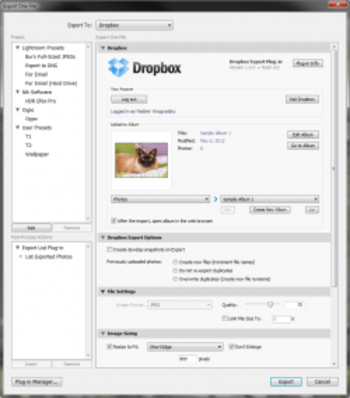 Dropbox Plug-in allows allows you to transfer your photos from Adobe Lightroom. It features supports export operations in Lightroom 2, 3, and 4, supports Publish operations in Lightroom 3 and 4, enables you to Import existing folder structure from Dropbox into Lightroom catalog, and provides automatic pairing of online photos with photos in the catalog based on photo name.