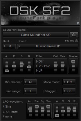 SoundFont banks are made of PCM-format base samples, loops or vibratos, which are mapped to various sections on musical keyboards. DSK SF2 can help users load these sound banks on their computer and render their music without having to use an external device that supports the SoundFont technology.