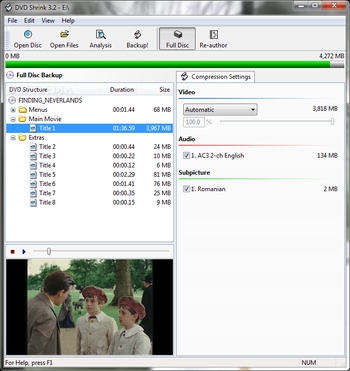 Just like its name suggests, DVD Shrink is capable of compressing DVD discs, saving disk space without affecting video quality. For instance, a regular DVD can get reduced to around 2.5 GB, which is a real achievement, enabling you to safely store backups on thumb drives.