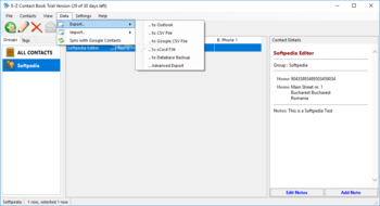 Export contacts from the entire book, or a filtered part of it into a comma-delimited (*.csv) file, vCard file, Microsoft Outlook, or Gmail CSV file, or save as database backup
