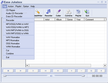 Ease Jukebox has 9 main functions: file manager, playlist, CD ripper, audio/data CD writer, recorder, audio converter, audio normalizer, file cut and file combine.