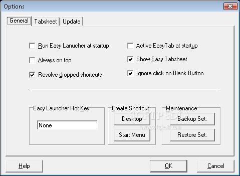 Easy Launcher allows to customize the tabsheet appearance, manage the tabsheet column and the hot keys; you can specify the program to run at the startup, always show on the top, show the settings at a separate tabsheet, resolve dropped shortcuts, create desktop shortcut, pin the shortcut to the Start Menu and ignore click on the blank button; the maintenance options let you back up the settings ore restore the settings if needed.