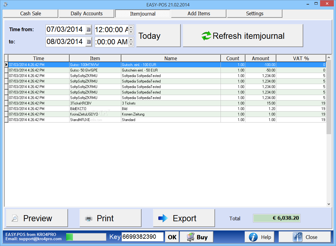 EASY-POS supports various paying methods, either by cash or credit card. The program creates a database with all the registered sales, thus keeping a detailed record of all the transactions made.