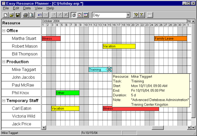 Easy Resource Planner is a program designed to help you schedule your resources from a single, easy-to-use interface. Resources might include people (employees etc.), equipment (for example overhead projectors, notebooks or cars) or facilities (such as conference and meeting rooms, training courts). Common uses are project planning, time tracking, staff scheduling, leave tracking, room scheduling, event management and equipment renting.