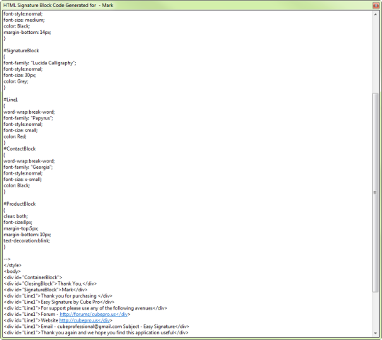 Easy Signature generates beautiful custom HTML email signatures.Its features include up to 8 custom text lines,select-able office, cell, email, and website entries,add disclaimers, quotes, and images,save information in xml for quick changes or as a template,and no programming knowledge required.