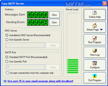 Send e-mail messages easily and securely from your portable PC while you are traveling around the world! Every time you change your location connecting your PC to different Internet Service Providers (ISPs), you must reconfigure your e-mail program to be able to send messages via different SMTP servers you have to use. Easy SMTP Server is a simple easy-to-use program working in background that lets you send e-mail messages directly from your PC bypassing ISP's SMTP servers. Using this program instead of your ISP's SMTP server you will increase your e-mail security and privacy as well as get rid of annoying change of settings for your e-mail program. Easy SMTP Server is easy to configure! The e-mail program you already use for sending and receiving messages can be connected to the server in a very easy way - just use the word "localhost" instead of your current SMTP host. Having done it, you can send messages in a usual manner. Easy SMTP Server is supported by all email programs including Outlook Express and Eudora. Easy SMTP Server is very fast! It may serve multitude of SMTP connections concurrently to use your Internet connection up to maximum. The user interface of the program is very easy to learn, excellent documentation is included. Try our Easy SMTP Server for free.