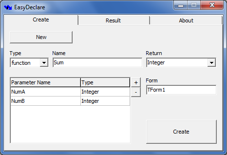 EasyDeclare is a small application that generates a standard code. With a GUI is more intuitive to declare a function. This tiny utility helps in your Delphi application development by defining functions all together with in one application.