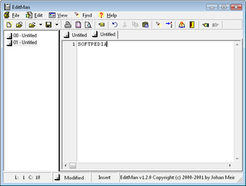 EditMan is an MDI (Multi-Document Interface) text-editor with a pagecontrol system which assigns a tabbed page for each open file, instead of having many open windows containing the contents of the file.
