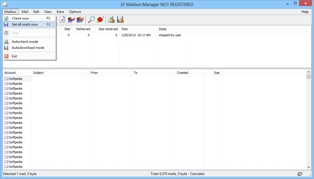 EF Mailbox Manager is a management program for as many as desired POP3 Accounts. It can automatically query into individually configurable poll time the mail servers or download the messages to the local computer for future use.