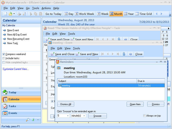 Efficient Calendar is a professional, cross-platform and easy-to-use scheduler, planner and reminder. You can sync data across PCs and mobile phones. It saves your time by allowing international holidays and major holidays of some countries to be imported directly. Multiple calendar views, such as Day, Week, Month and Year views as well as list view are available so you can better arrange and track your appointments and events. Events and tasks can be managed by grouping and differentiated by colors, so you can manage schedules in the most visual ways. The "First Thing First" principle is followed and you can set importance and priorities for events and tasks. By setting subtasks at any level, you can better organize and manage the to-do list. All appointments, meetings, events and tasks can be reminded in time as you configured, and you will never miss any important event! An important feature is the comments of events and tasks can be edited in the same way as Microsoft Word does. Besides, the software also provides various other unique features, such as adding attachments, Recycle Bin, displaying entry list in card view, etc. The interface of the software looks fashionable and cute. It has 10 interface styles of different tones of color for you to choose from! Begin to use Efficient Calendar now to help you manage time, save time and finally, control time, and you can go along a highly efficient, happy and successful road.
