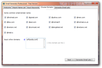 This utility allows you to select the e-mail domain names, while it provides support for some of the well-known e-mail services, such as Hotmail, Gmail, Yahoo, MSN, AOL, Verizon, Comcast, SbcGlobal, Netzero or Mail.ru. However, you are not limited to these options, as you have the possibility to include other domains in your output e-mail list.