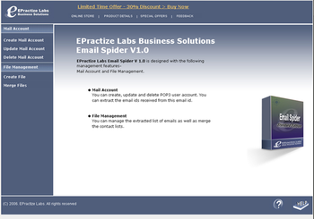 File Management - You can create list of extracted unique email ids from your mail account. You can recursively extract email ids from remote sites, from local html files as well as from your online subscription manager. You can merge contact lists to create list of unique email ids. This increases the performance of your contact list. Email Spider has built-in Email Verifier and Validator. You can create your contact list by checking the validity of email ids without sending emails to those email ids.