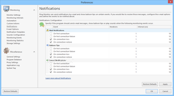 If you would like to get notifications about Connection Lost, Connection Restored and other events detected by the application, you can configure the application to send e-mail notifications, play sounds and show Windows Tray balloons. The application can send a single notification of any type or repeat notifications multiple times.