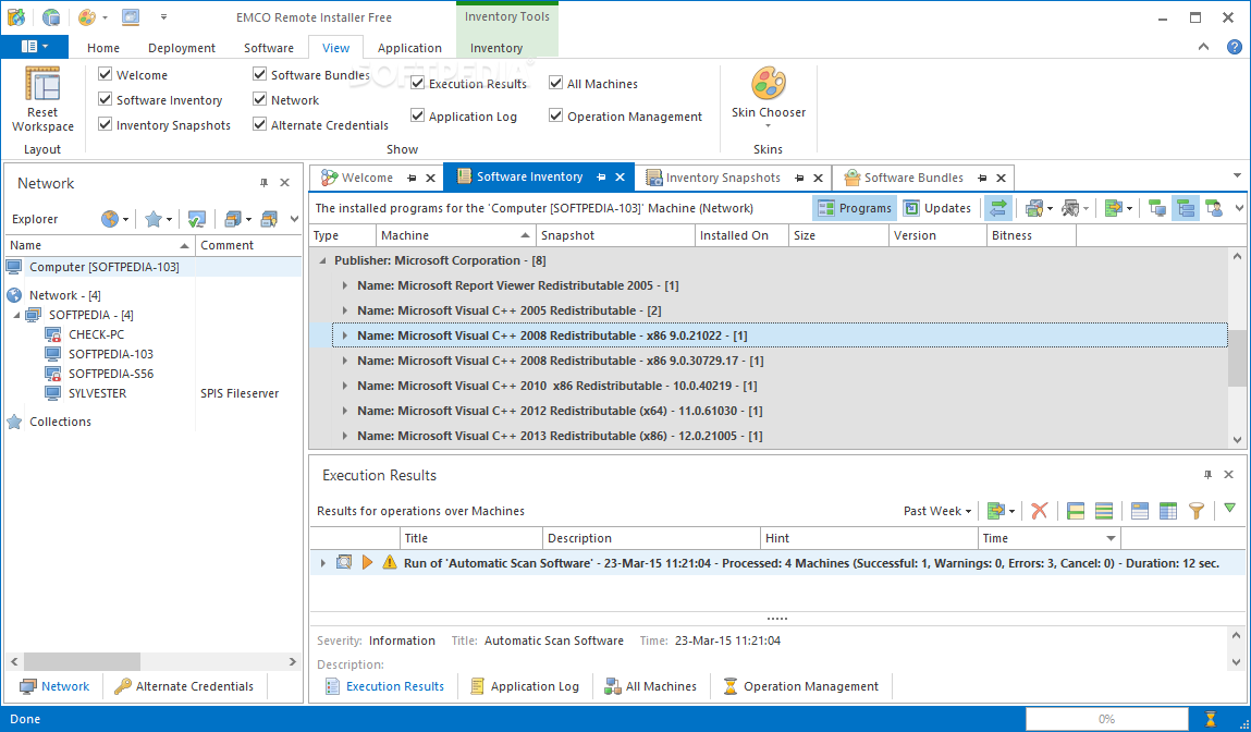 Install, uninstall and repair EXE installations, MSI and MSP packages on one or multiple selected remote PCs over a LAN.