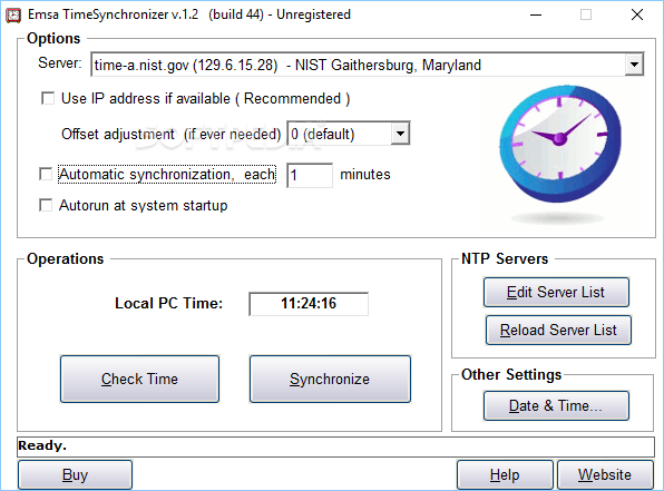 It is possible to adjust a few parameters, such as toggling automatic synchronization, enabling autorun or setting an offset adjustment if needed. More so, you can reload the server list or check the time by pressing the corresponding buttons. The system time is displayed in the Operations pane.