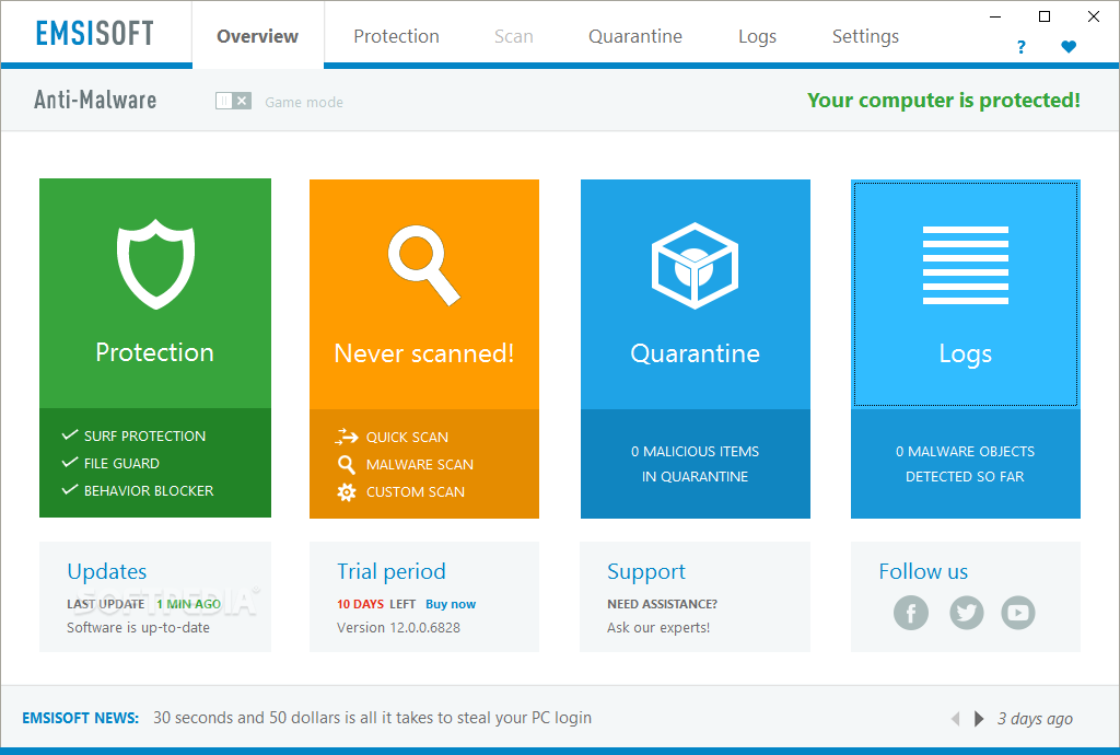 You can download Emsisoft Anti-Malware which is 258.01 MB in size and belongs to the software category Antivirus. Emsisoft Anti-Malware was released on 2017-04-20 and last updated on our database on 2017-06-13 and is currently at version 2017.5.