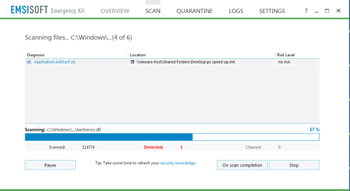 The Emsisoft Emergency Kit contains a collection of programs that can be used without a software installation to scan and clean infected computers for malware: Emergency Kit Scanner, Commandline Scanner, HiJackFree and BlitzBlank. Emsisoft Emergency Kit Scanner: With the Emsisoft Emergency Kit Scanner you have got the powerful Emsisoft Scanner including graphical user interface. Search the infected PC for Viruses, Trojans, Spyware, Adware, Worms, Dialers, Keyloggers and other malign programs. Emsisoft Commandline Scanner: This scanner contains the same functionality as the Emergency Kit Scanner but without a graphical user interface. The commandline tool is made for professional users and can be used perfectly for batch jobs. Emsisoft HiJackFree: HiJackFree helps advanced users to detect and remove Malware manually. With HiJackFree you can manage all active processes, services, drivers, autoruns, open ports, hosts file entries and many more. For your full control over your system. Emsisoft BlitzBlank: BlitzBlank is a tool for experienced users and all those who must deal with Malware on a daily basis. It deletes files, Registry entries and drivers at boot time before Windows and all other programs are loaded.