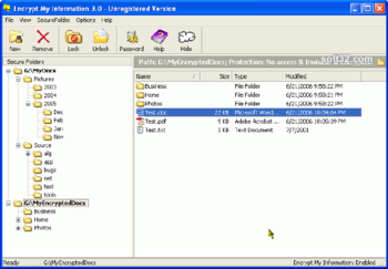 Encrypt My Information allows you to hide folders and encrypt files with on-the-fly AES encryption. Just create one or more encrypted secure folders from local folders and move your sensitive files into these specified folders and they will be encrypted/decrypted in real-time. You can work with the files as usual, and when you finish, lock the secure folder, which will store the files securely and also hide the entire folder from view.