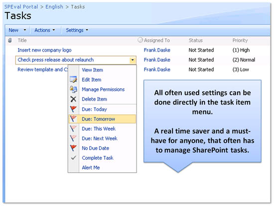 The Enhanced SharePoint User Tasks Menu feature enables users to assign the due date, completion and other properties of a tasks item directly with one click using the items menu: