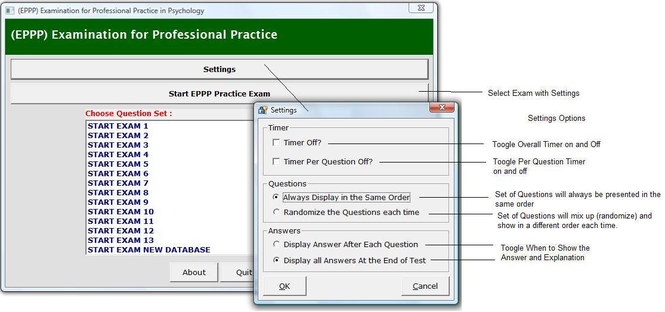 Contact us for exam simulator software to help you pass the EPPP (Examination in professional practice in psychology) exam. Our EPPP question simulation software has 4050 exam question in just $99.95. The Program creates 225 question, multiple-choice based test sets drawing material from the following content areas: Biological bases of behavior (11%) Cognitive-affective bases of behavior (13%) Social and multicultural bases of behavior (12%) Growth and lifespan development (13%) Assessment and diagnosis (14%) Treatment and intervention (16%) Research methods (6%) Ethical, legal, and professional issues (15%) The Timer gives users 4 hours and 15 minutes (255 Minutes) to complete each exam. You have the Edge! You now have an "insiders view" of the EPPP Exam in every detail, in the exact Environment and patterns as test day! Gain Confidence and reduce study time. 4,050 Total Questions. Unique, no 2 questions are the same. The largest unique database of questions in one program. See Screenshots. Questions are Situational and Complex. No Easy Questions, NO True/False Questions, NO Questions outside of Association of State and Provincial Psychology Boards recommendations. Two Timers®" with on/off functions! You have a choice of a "per question" timer (1.13 minutes per question) to track your time usage per question and a "per exam" timer (255 minutes per exam) which displays time left for the entire exam. Learn to manage your exam time.