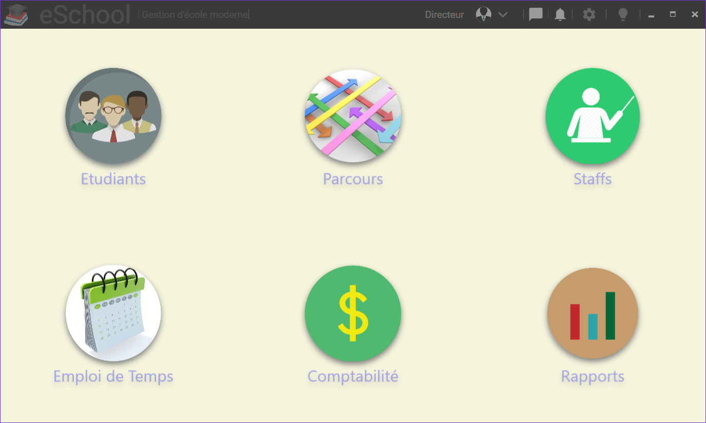 eSchool is and administrative platform for public and private schools. This platform is equipped with all the features you will need to make it easier for you to manage your schools. Registration and annual re-registration of students Management of courses and classes LMD or traditional system Use of class time Payments for tuition fees Absence management Management of exams, planning, correction and automatic calculation of averages Personnel management, positions, salaries, absence, personal profile Graphic display of enrollment statistics, annual registrations and payments. This application facilitates the use of computers in schools ranging from a small school to a faculty.