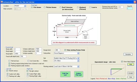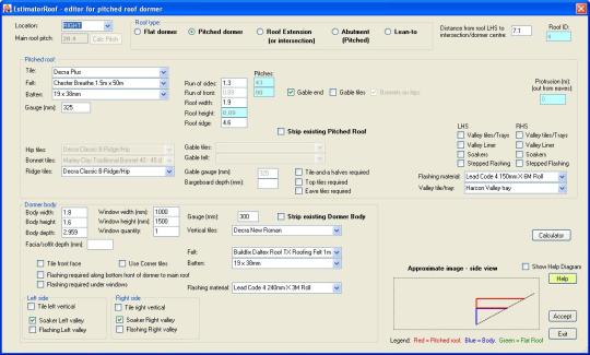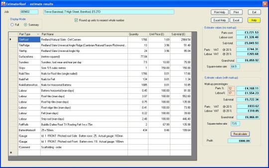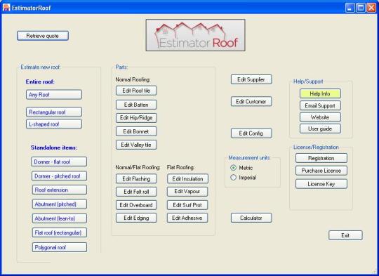 EstimatorRoof is a roof estimating software package to enable roofers, builders and quantity surveyors to quickly create roof estimates, measurements and parts lists for roof fitment and roof replacement. This covers fit and strip-and-fit roofing - it does NOT design the roof trusses. This product is a roof tile estimator (pitched roof) and a flat roofing estimator in one. EstimatorRoof calculates the actual parts required - it does not base its calculations on square meterage. This makes it far more accurate than other estimators. It provides less wastage, less risk of a parts shortfall (time wasted on site) and more confidence in the estimates. Full parts and labour breakdown. Metric and Imperial. Any currency.