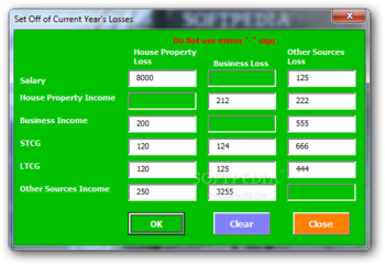 It allows you to enter all your incomes: business income, house property income, capital gains and so on. In addition, it also takes into account the accumulated losses when calculating the corresponding tax.System requirementsExcel 2003 or later