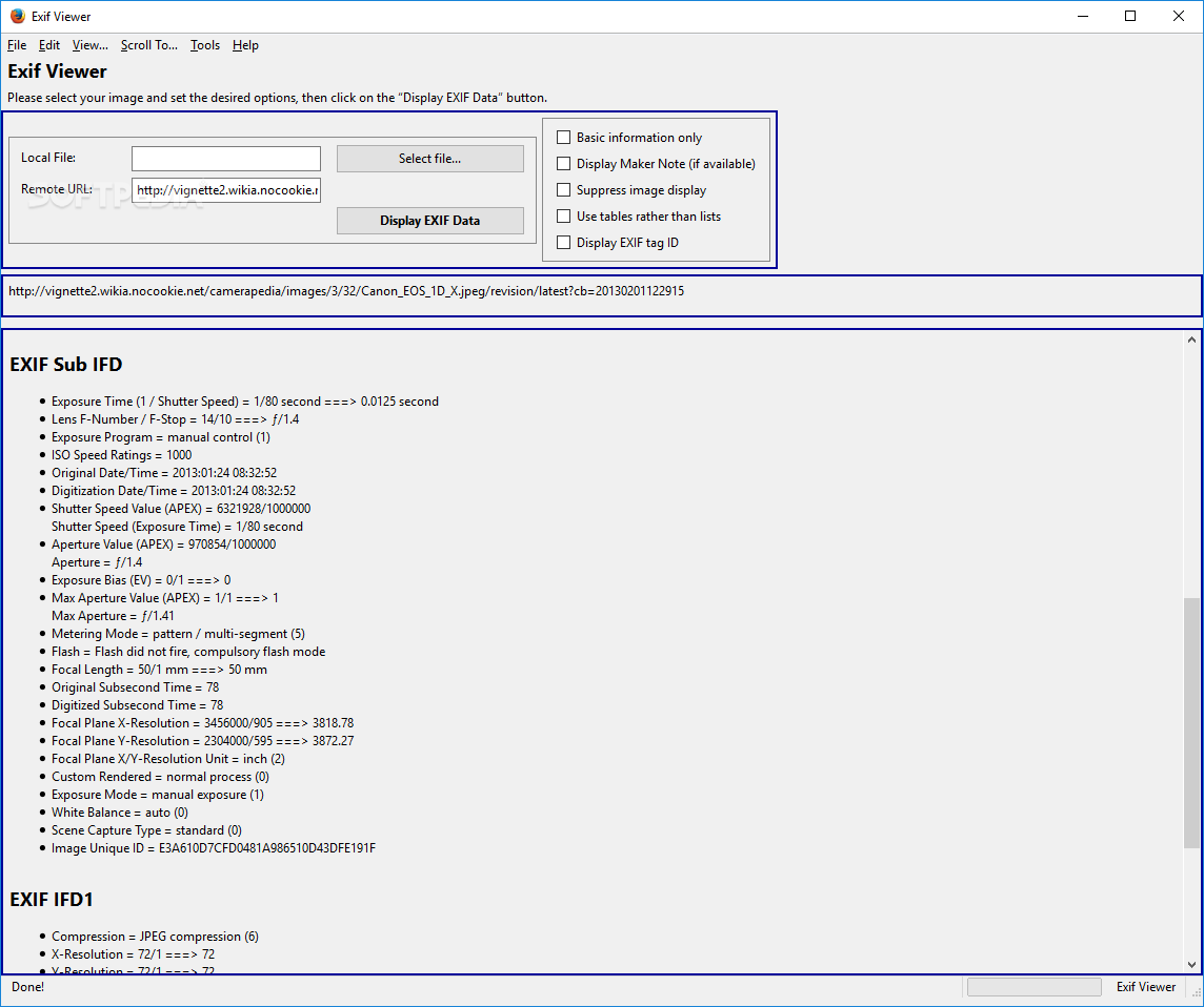 In either case, you are greeted by Exif Viewer's popup main window. The extension sports an intuitive yet quite outdated user interface. The first thing we should point out is the fact that it can display metadata for remote as well as local JPEG images.