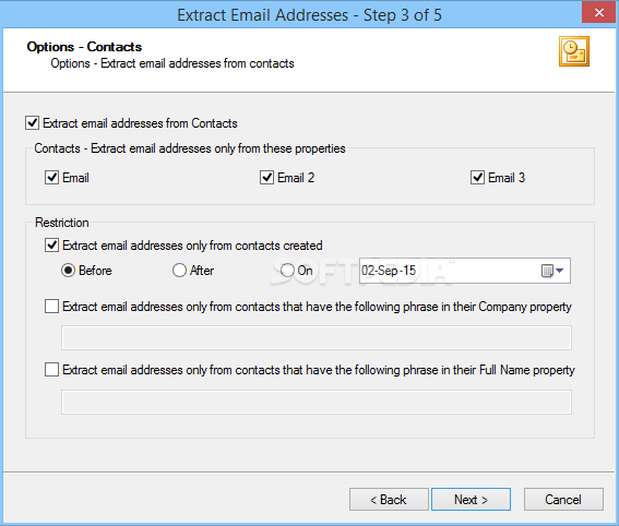 You can download Extract Email Addresses from Outlook which is 4.11 MB in size and belongs to the software category E-mail. Extract Email Addresses from Outlook was released on 2016-07-12 and last updated on our database on 2017-04-14 and is currently at version 5.3.