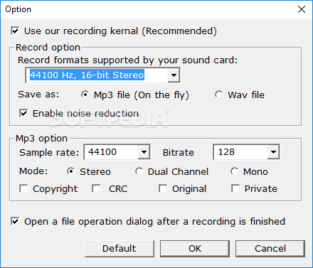 Fast Sound Recorder is able to automatically detect the recording formats your sound card supports and then set the application's parameters for the best possible performance. The default parameters work in most cases, but you can change them easily to best suit your needs.
