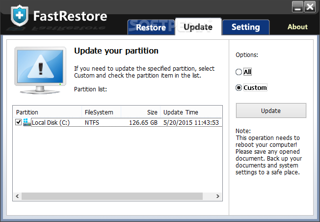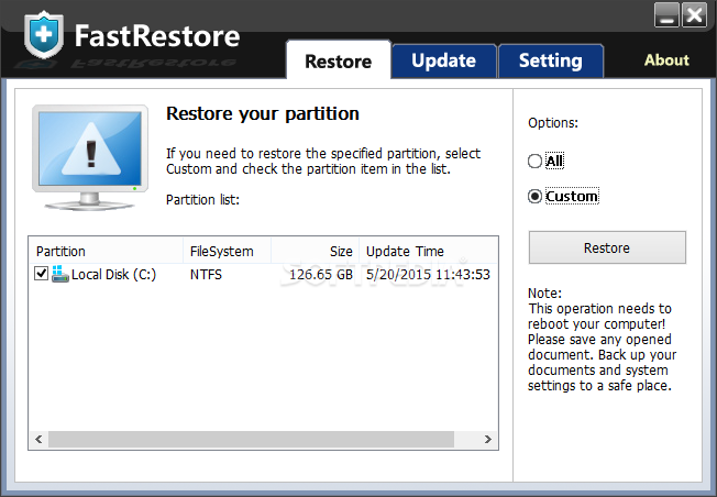 FastRestore is an application that is able to restore protected areas like OS or partition to its original configurations each time it restarts.