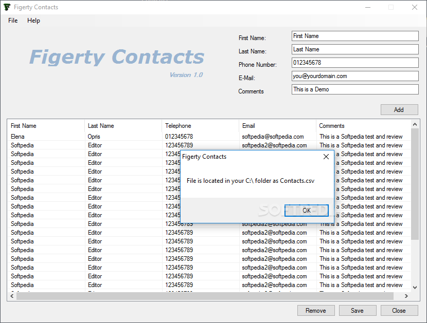 Figerty Contacts is a free software by Dan O'Riordan and works on Windows 10, Windows 8.1, Windows 8, Windows 7, Windows XP, Windows 2000, Windows 2003, Windows 2008, Windows Vista, Windows 2012.