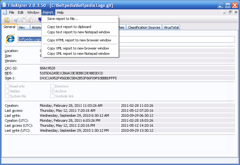 General - The initial information FileAlyzer will show is not much different from what the Windows Properties dialog will show you: file name and location, size, date & times, version and attributes. In addition to those, FileAlyzer will show you both the CRC-32 and the Message Digest 5 checksum of the file, too.
