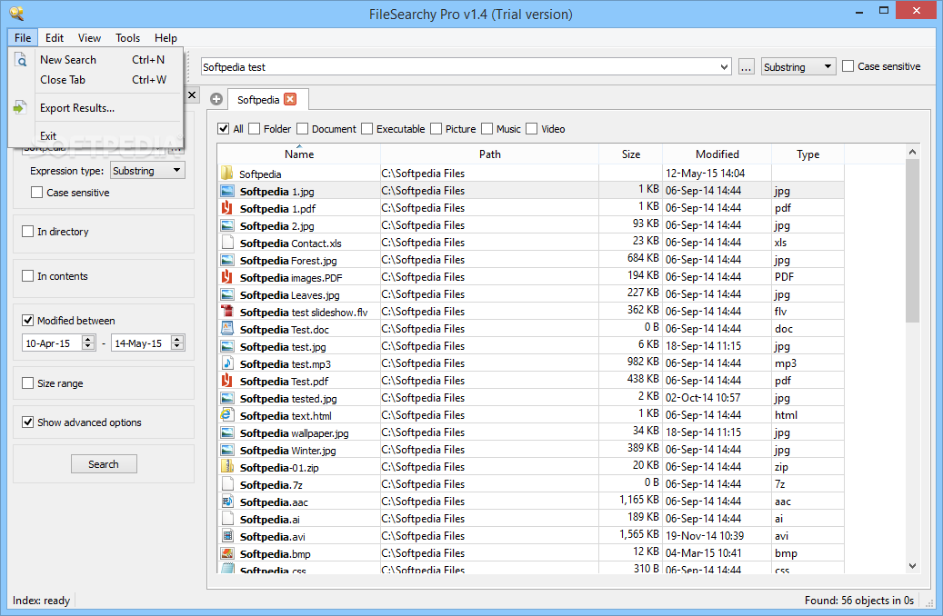 If you want to further fine-tune your search, you can specify additional info about the file you are looking for, such as defining its modified date or size ranges. You can also examine text contents by entering substrings, regular expressions or whole words which should be included or excluded from search.