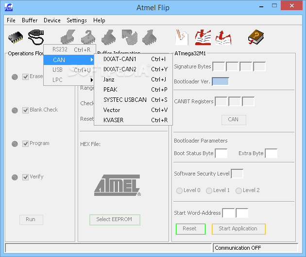 Please note that this application only works with FLASH C51 devices and some AVR ones, but only if a bootloader has been downloaded to the device beforehand.