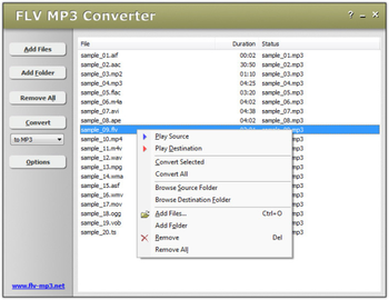 FLV MP3 Converter converts FLV to MP3 and MP3 to FLV. The program supports the latest version of FLV file including FLV on YouTube, Google Video, Yahoo Video, and so on.FLV MP3 Converter is also an ALL IN ONE audio converter that supports more than 100 audio and video files, and convert file to major audio formats, for example, MP3, WMA, AAC, M4A, M4B, OGG, APE, FLAC, WAV, AIFF, MPA, and so on. The program is a professional audio converter that enables you customize encoding codec, sample rate, bit rate, channels, and volume as you like.