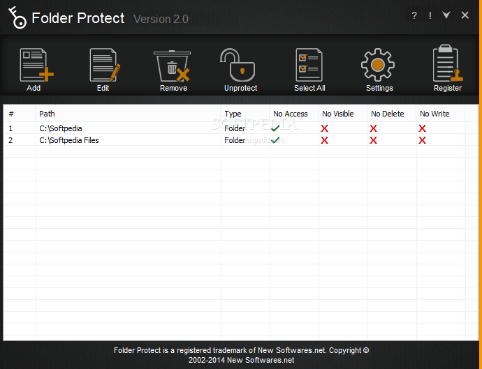 The file queue displays the location, type and permissions for each item. When it comes to editing permissions, Folder Protect allows you to prevent users from accessing, deleting, viewing and writing data.