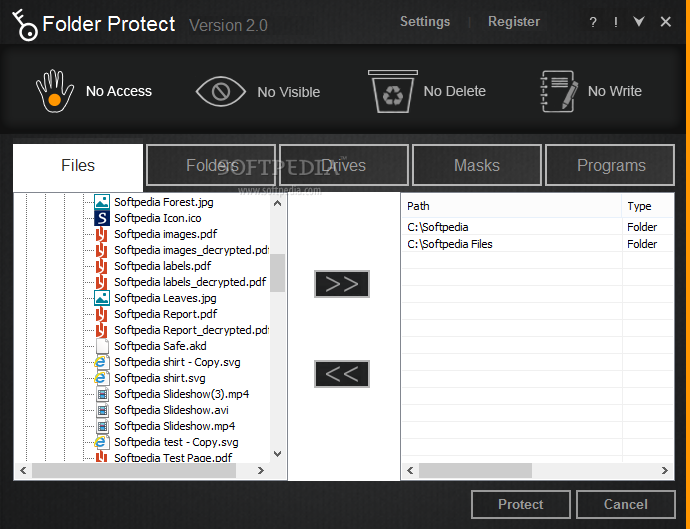 Folder Protect represents a security solution for your files, folders, drives, masks and programs. It is highly advised to use this type of tool when sharing your computer with multiple users, since it helps protecting the privacy of your information.