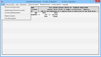 FomSoft Disk Doctor allows you to view technical data about the disks mounted on your system, including connection type, partitions, capacity and model. Physical and logical disks alike can make be subject for observation. The software allows you to disable logical drives from the system, as well as reconnect previously disabled partitions.