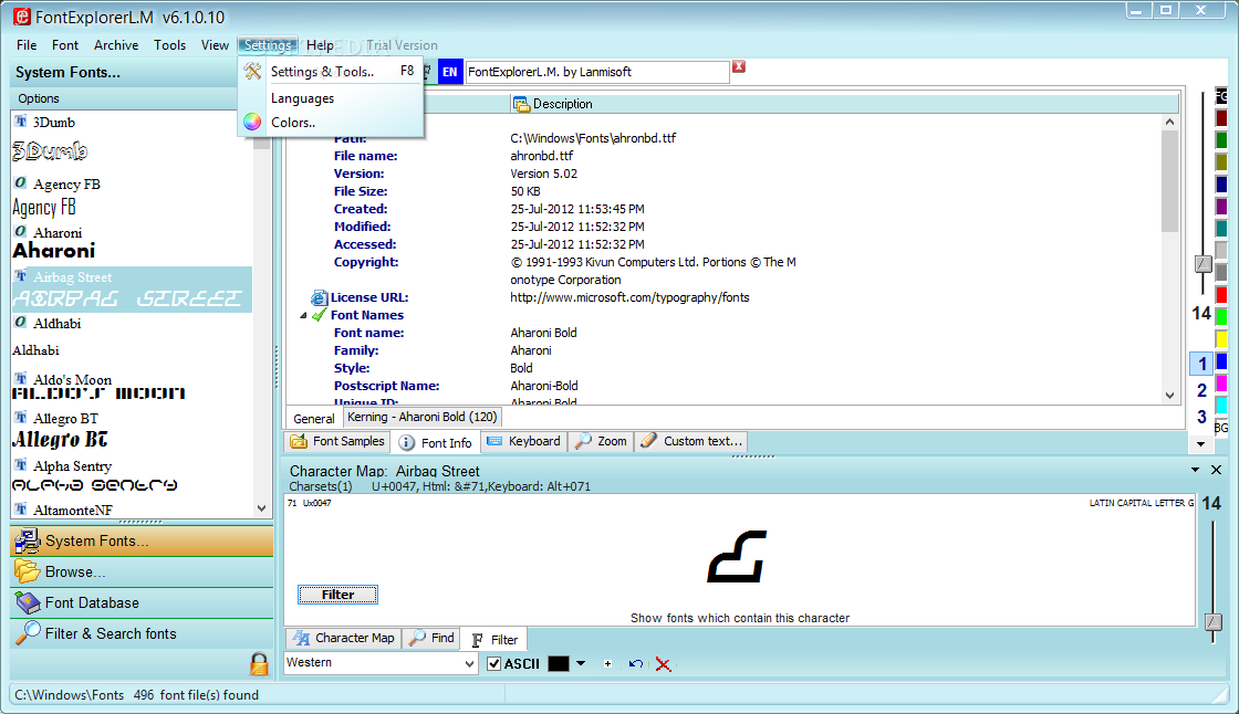 The software enables you to easily install, uninstall or move the font files to other locations. Moreover, you can manage the fonts database by adding new files, removing the damaged sets or repairing the invalid registries. The software also features a powerful searching engine that enables you to apply several filters and quickly identify the font you are looking for.