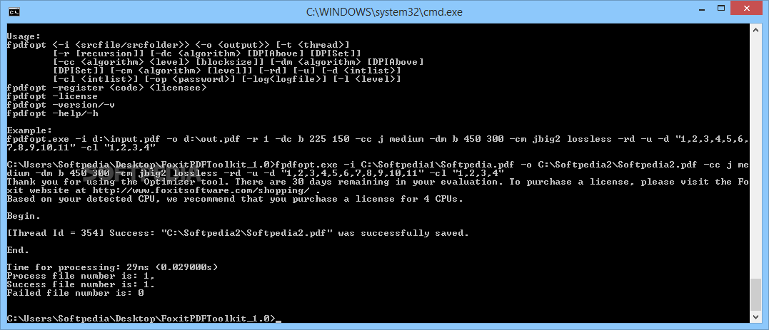 Foxit PDF Toolkit is an all-in-one PDF conversion, optimization, watermarking, and protection suite that bundles various command-line utilities ready to assist you in handling such documents. Without requiring installation, the toolkit can be easily deployed and integrated with your own applications, so as to add them PDF processing capabilities.