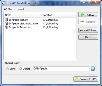 Afterward, you can set the preferred output location, or you can export the MP3 to the same folder as the source file. When you have completed setting up all these small details, you can press the 'Convert to MP3' button and Free AVI to MP3 Converter will generate the audio files you need, placing them in the previously defined directory. Such a tool can prove particularly useful when you have the videos of your favorite artist, for instance, on your PC, and you just need the song to listen on your MP3 playing device.
