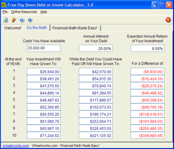 You can download Free Pay Down Debt or Invest Calculator which is 786.62 KB in size and belongs to the software category Accounting and Billing Software. Free Pay Down Debt or Invest Calculator was released on 2011-07-22 and last updated on our database on 2017-04-17 and is currently at version 4.5.