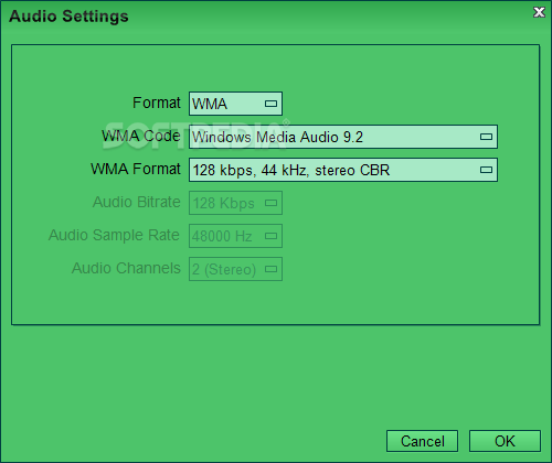 For instance, you can set the WMA code and profile (including channels and bitrate) and the bitrate, sample rate or channels for the MP3 option.