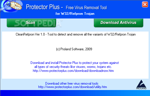 You can download Free Virus Removal Tool for W32/Refpron Trojan which is 402.18 KB in size and belongs to the software category Removal Tools. Free Virus Removal Tool for W32/Refpron Trojan was released on 2010-08-06 and last updated on our database on 2017-02-27 and is currently at version 1.
