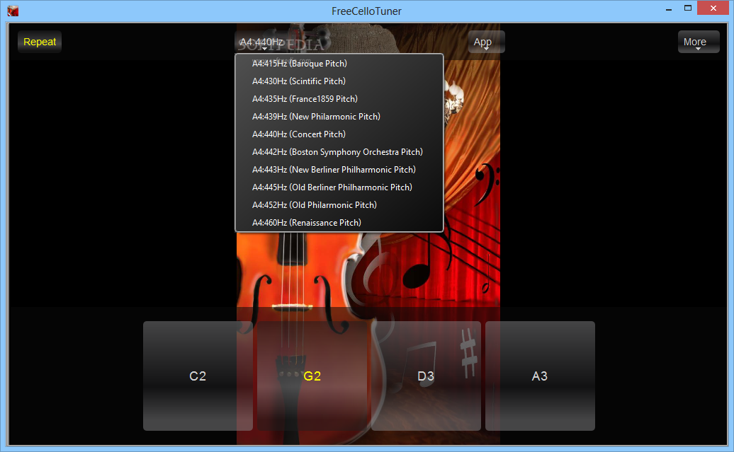 FreeCelloTuner is simple to use and it can help you re-tune your musical instrument in a short time. The software offers several genuine cello sounds, corresponding to the natural chords of the instrument, that can guide you in obtaining the correct calibration. Moreover, FreeCelloTuner can help you string your cello according to different pitches.