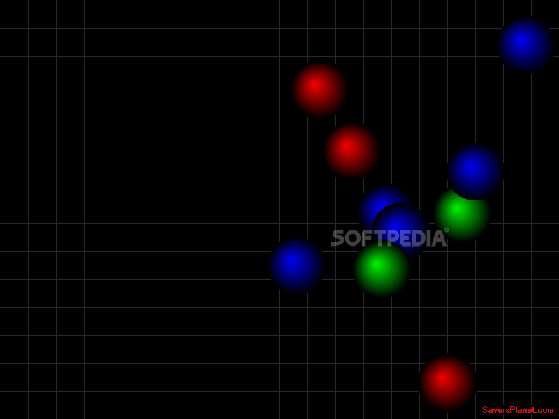 It displays a bunch of balls bouncing around your screen in what appears to be a gridded space. The balls are colored in red, green and blue and they never touch each other, they overlap each other and only bounce when they reach the edge of the screen.