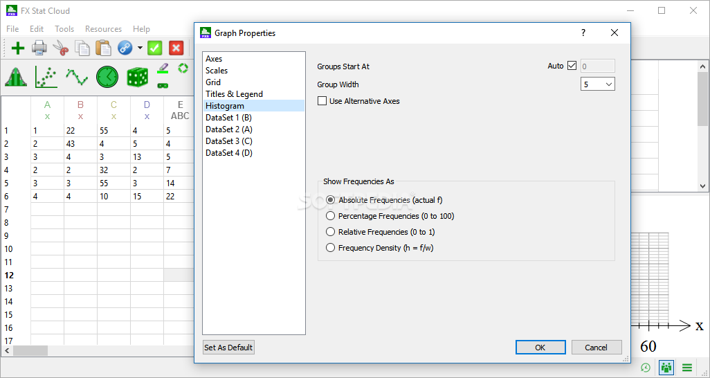 FX Stat can produce frequency tables, cumulative frequency tables and grouped data from raw data automatically.