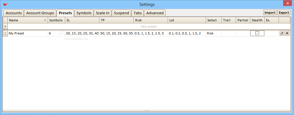 All trades done through 1-Click Execution are setup through the use of presets. You predefine your stop loss and take profit levels in pips, and your risk percentage and lot values. Before placing a trade you can very easily select the stop loss and take profit with a click, as well we as the risk or lot size.
