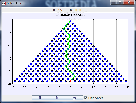 A Galton board is a vertical board with N rows of pegs onto which a ball is dropped.  Each time a ball hits a peg, it has a probability p of bouncing to the left and a probability of 1-p of bouncing to the right. Galton Board Model simulations histogram will display the distribution of final x-coordinates as each ball leaves the board and is collected into bins.System requirementsJava